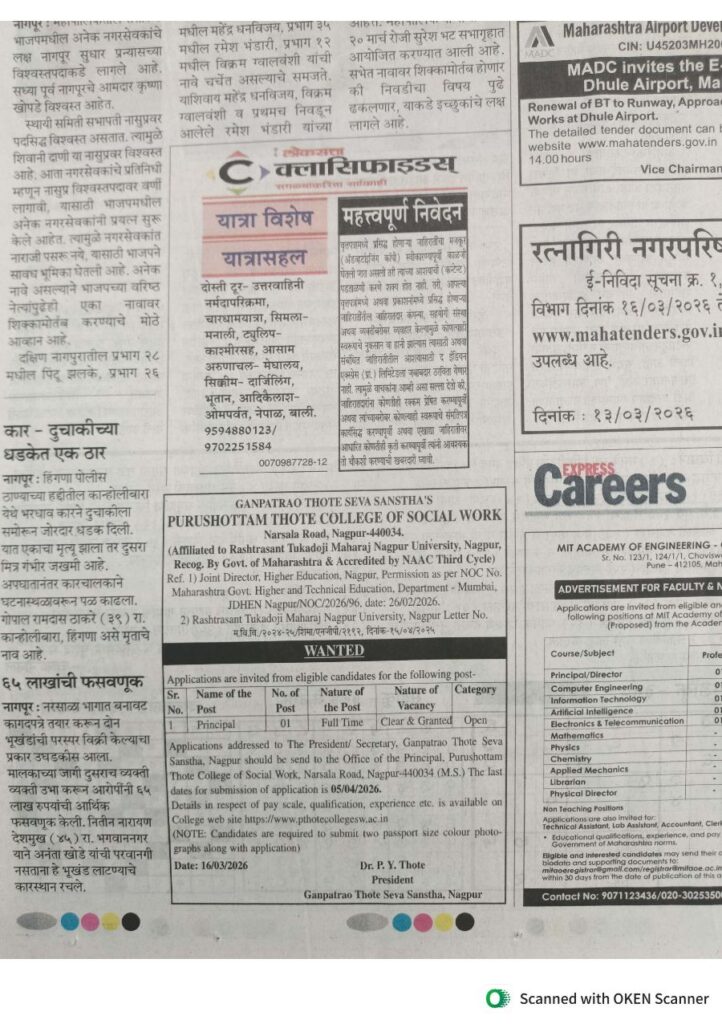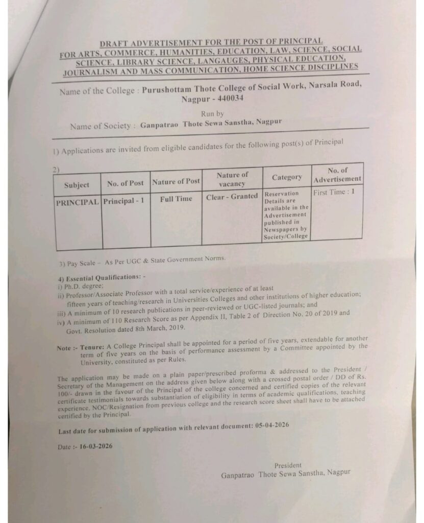 The trustee of the society Dr. Purushottamji Thote founded the Ganpatrao Thote Seva Sanstha in 1991. Through this trust, he founded a small unit of Yashwantrao Thote Mountessary Teachers Training Institute (YTMTTI), prier institute to meet the pressing need for scientific training in Social Work. At that time in the pick years of his life simultaneously he was devoting his professional knowledge and started Purushottam Thote College of Social Work in 1993.